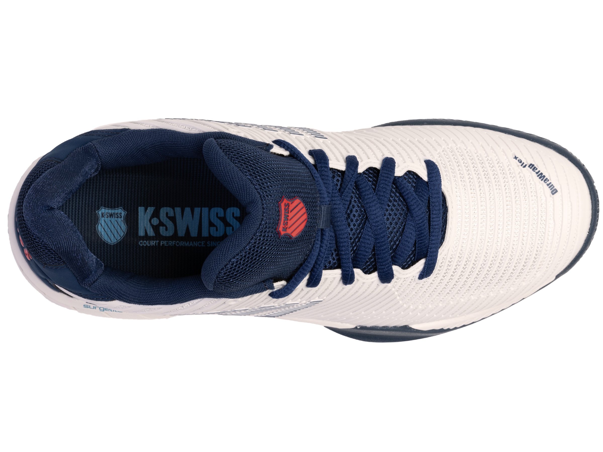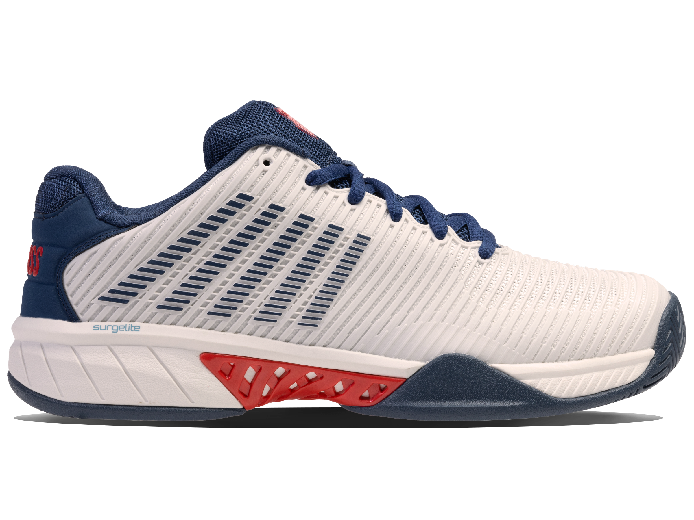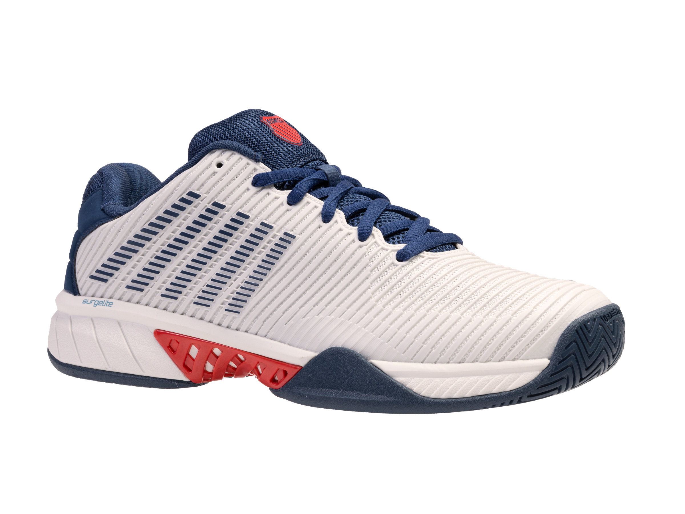 De Hypercourt Express 2 is geïnspireerd op de originele klassieke tennisschoen, maar voorzien van de nieuwste materialen en technologieën voor de juiste ondersteuning en extra comfort. De schoen heeft een normale pasvorm en beschikt over een bovenzijde van synthetisch materiaal en mesk materiaal die zorgt voor een prettige combinatie van lichtgewicht comfort en ondersteuning. Bovendien zorgt het waterafstotende effect van de bovenzijde ervoor dat de schoen niet zwaar wordt en de voet droog blijft. De mesh tong en mesh panelen in het bovenwerk zorgen voor een hoog ademend vermogen en uitstekende ventilatie waardoor de voeten koel en droog worden gehouden. De Surgelite tussenzool zorgt voor maximale schokdemping en extra duurzaamheid. De tussenzool bevat tevens de ‘GuideGlide’ constructie en garandeert een comfortabele en stabiele loopbeweging. De Ortholite binnenzool zorgt daarnaast voor lichte demping. De heel grip lining vermindert slijtage. De DuraWrap en DragGuard in de buitenzool zorgen voor een extra laag bescherming op essentiële steunpunten van de schoen. De non-marking buitenzool maakt de schoen geschikt voor gravel, smashcourt en kunstgras.