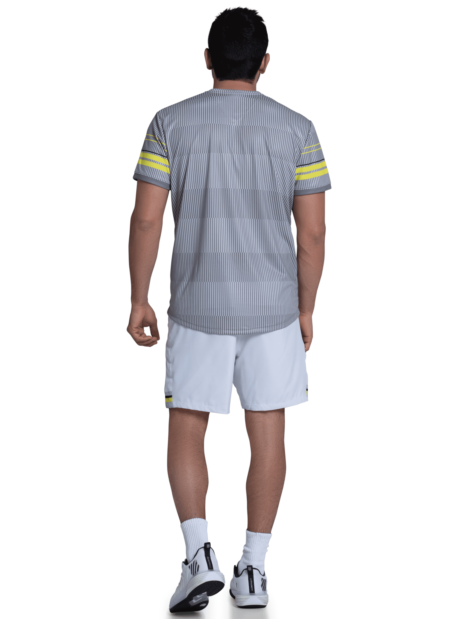 Made to elevate your game. This crew neck tee is done in a moisture-wicking performance jersey fabric that will keep you cool and ready to dominate on the court. The monochromatic print has a striking yellow rugby chest stripe which becomes even more striking with every crushing forehand swing.