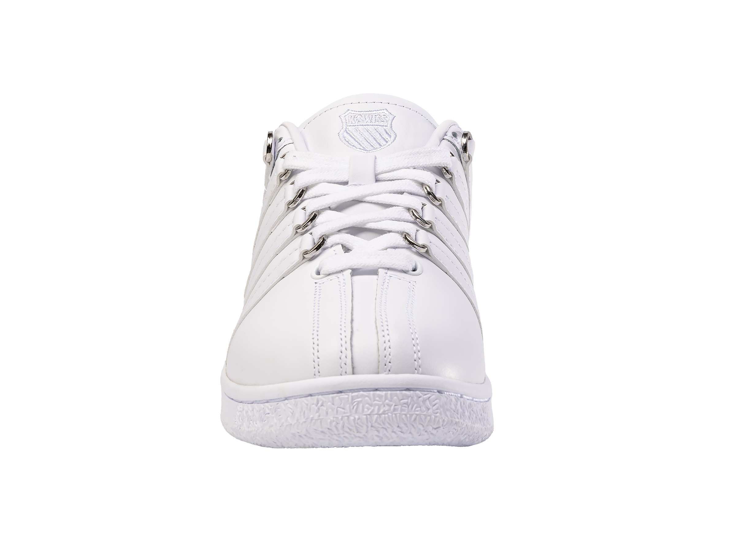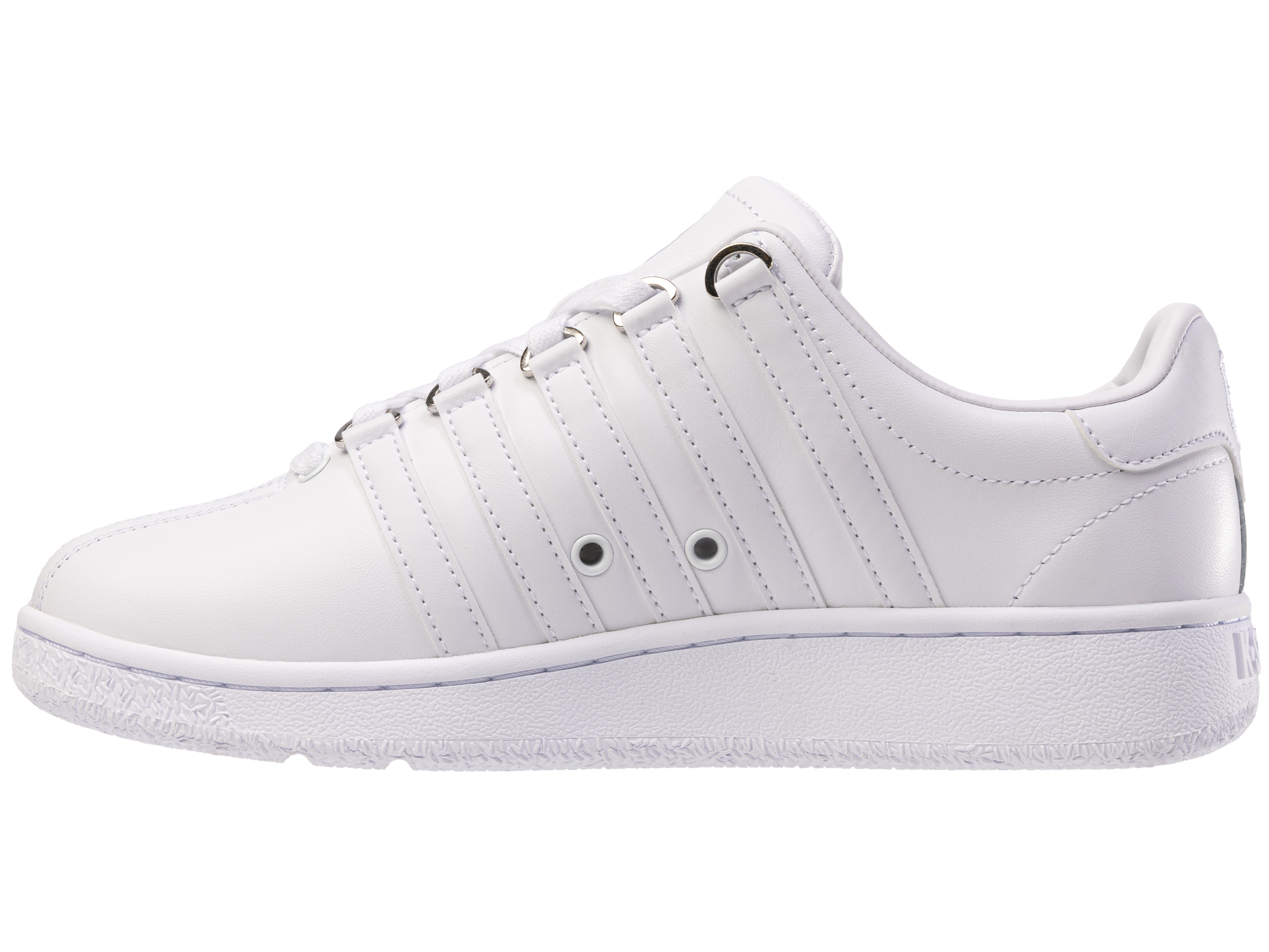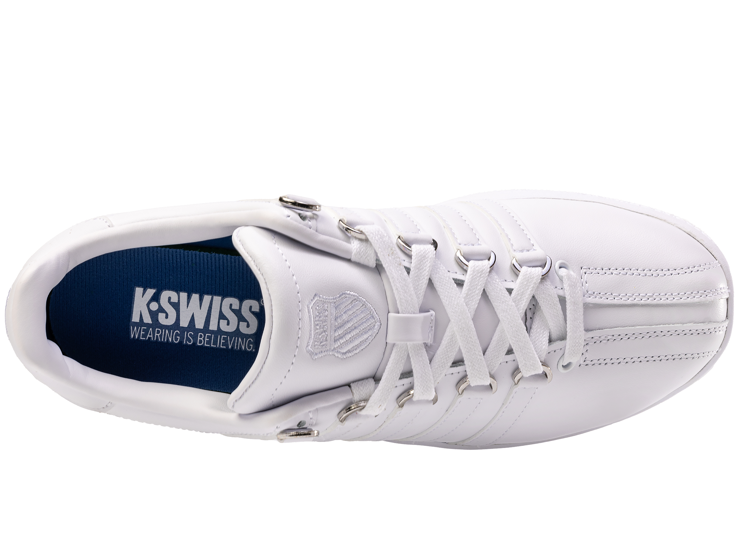 K-Swiss was founded in 1966 when two Swiss brothers, Art and Ernie Brunner, moved to California to create a footwear brand focused on tennis. As avid skiers and tennis players, the brothers took inspiration from leather ski boots to create a court shoe that supported the aggressive side-to-side movements of tennis. The result was the K-Swiss Classic, the first all-leather tennis shoe manufactured in Los Angeles, California. Over 50 years later that innovation is still the most recognized and bestselling style in our company and has achieved iconic status in the sneaker industry. The Classic VN is the 4th generation of the original shoe. It maintains the trademark elements featured on the first design: 5 stripes, D-ring lacing system, 3 piece toe construction and herringbone brick outsole tread, yet offers the addition of a heel tab that allows for a hint of color and our modern logos to represent the contemporary and progressive values of today’s brand. The Up-spec version of the VN modernizes our classic shoe with better materials, increased comfort, and improved sustainability. The upper features more premium full-grain leather. The shoe’s sustainability has improved by way of the addition of recycled PET linings and laces, internal components made using recycled ocean plastics, and more eco-friendly foam materials in the sock liner and internal midsole. Born out of innovation, the Classic has evolved into a statement of timeless simple design, an expression of our passion for quality and craftsmanship, and an enduring symbol of our authentic tennis heritage.