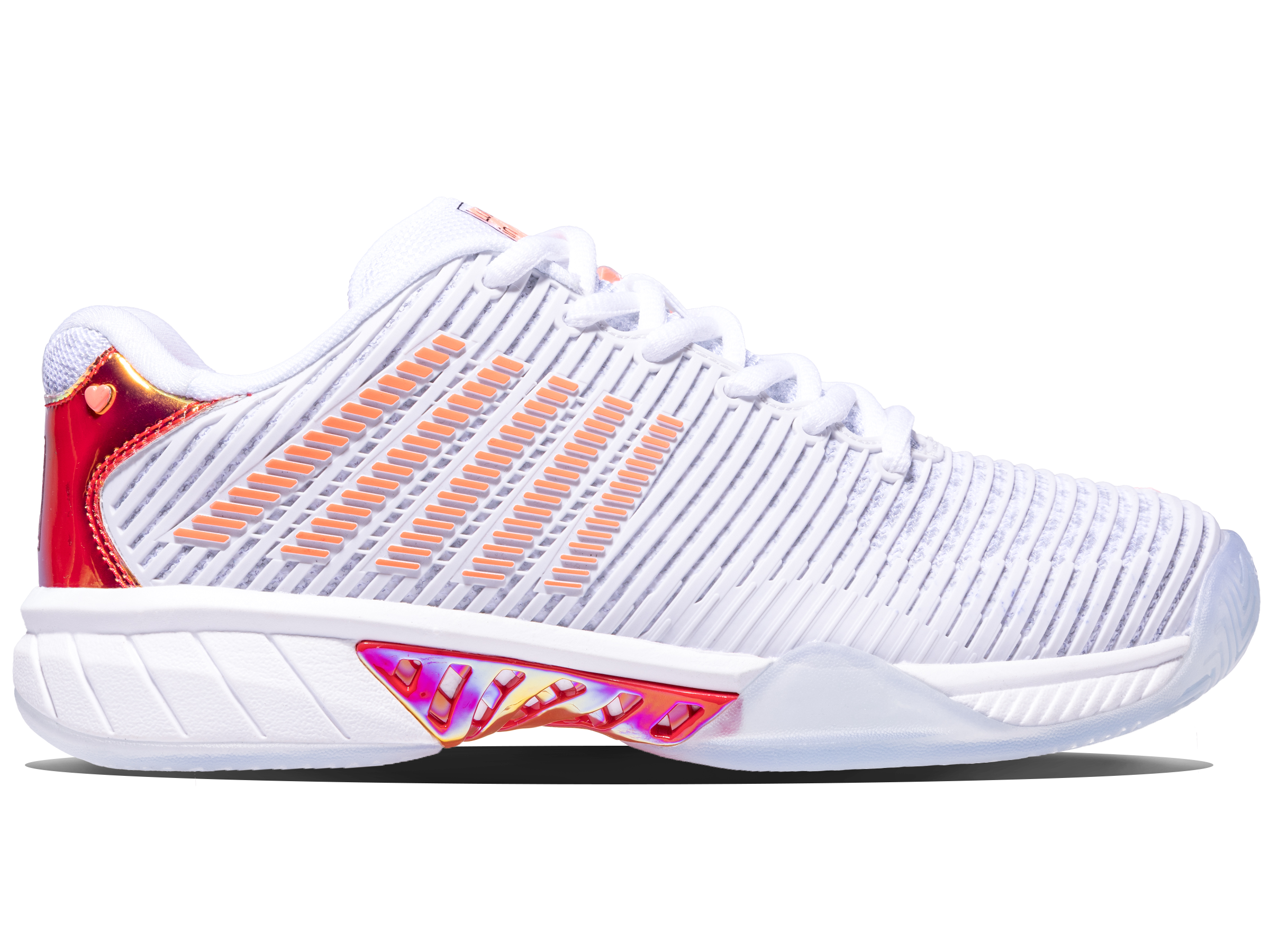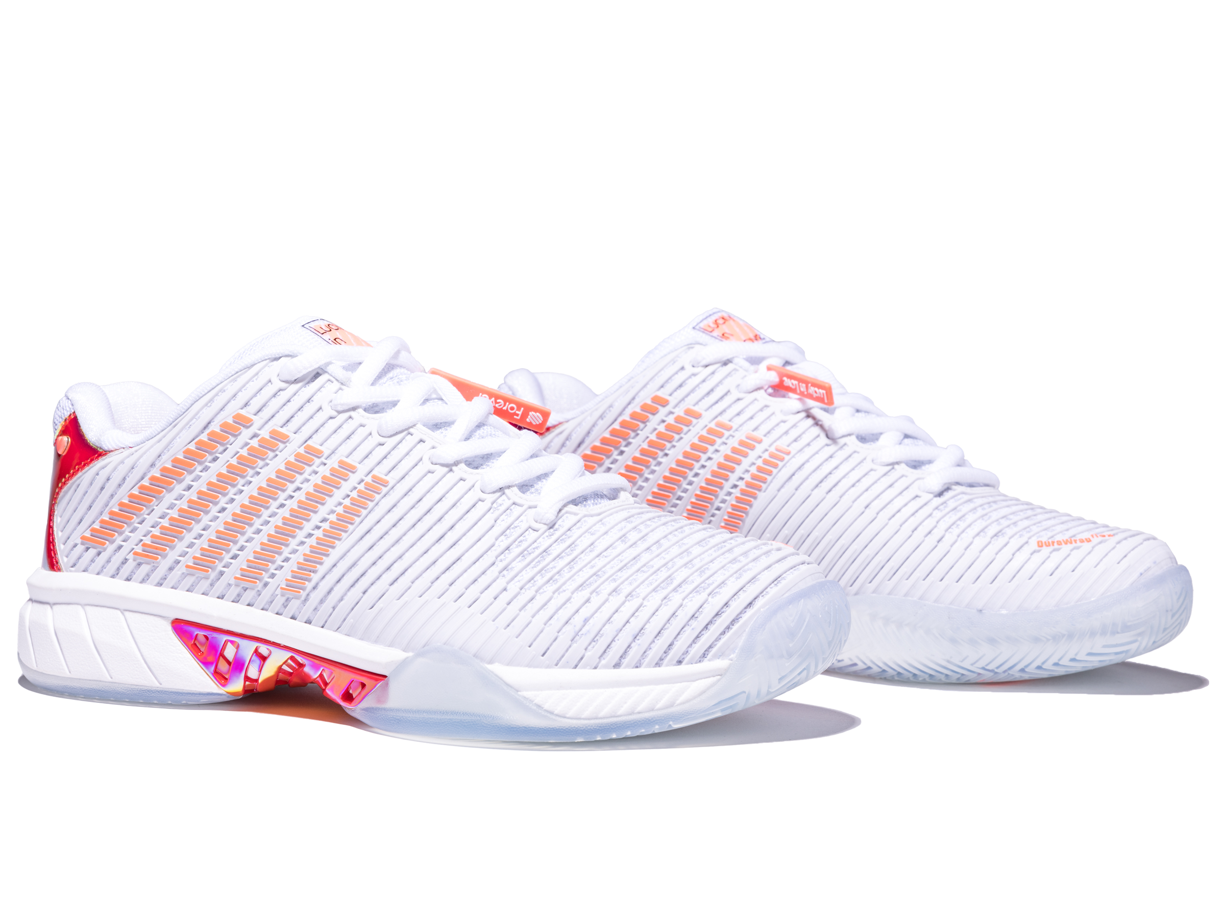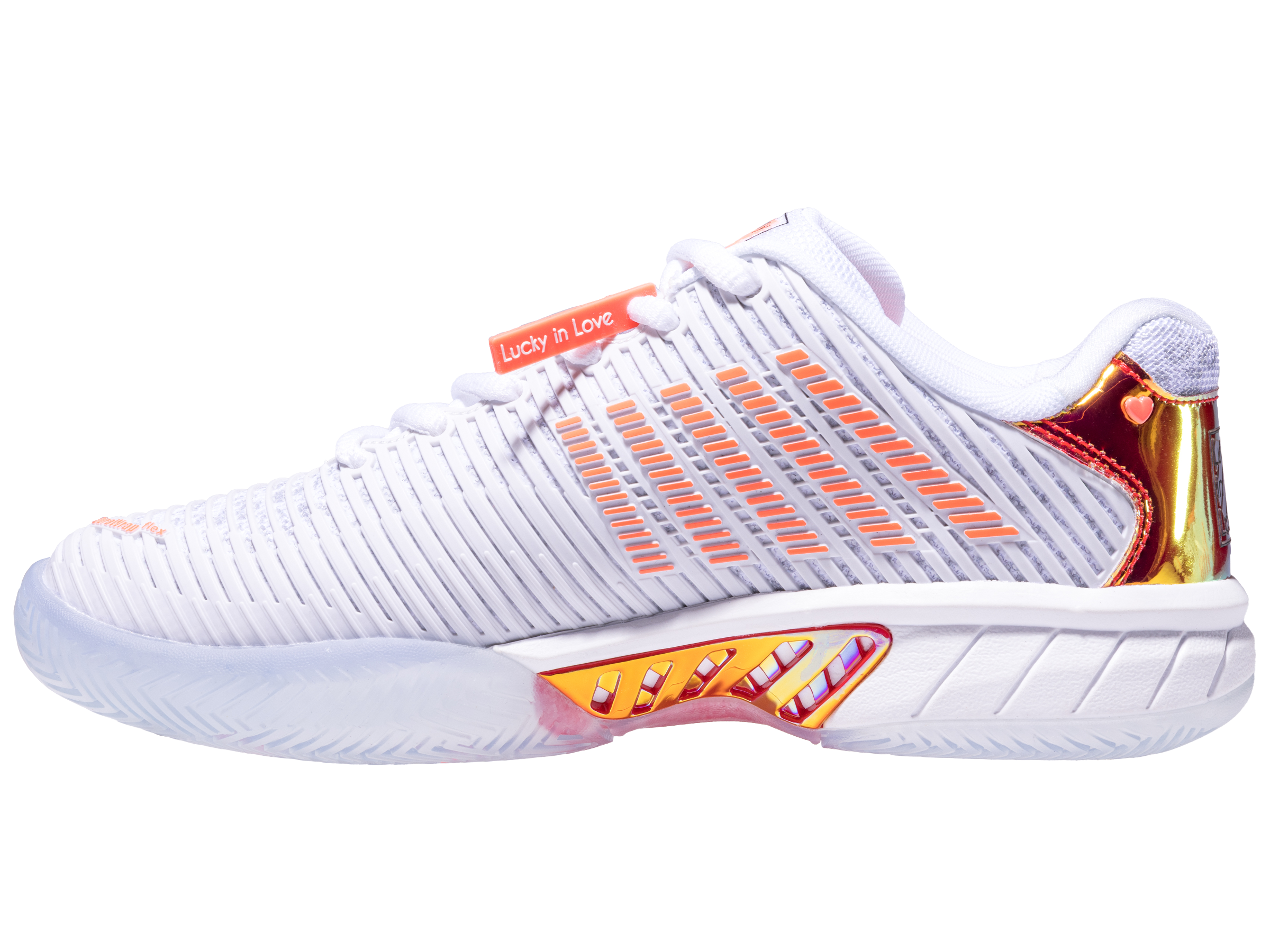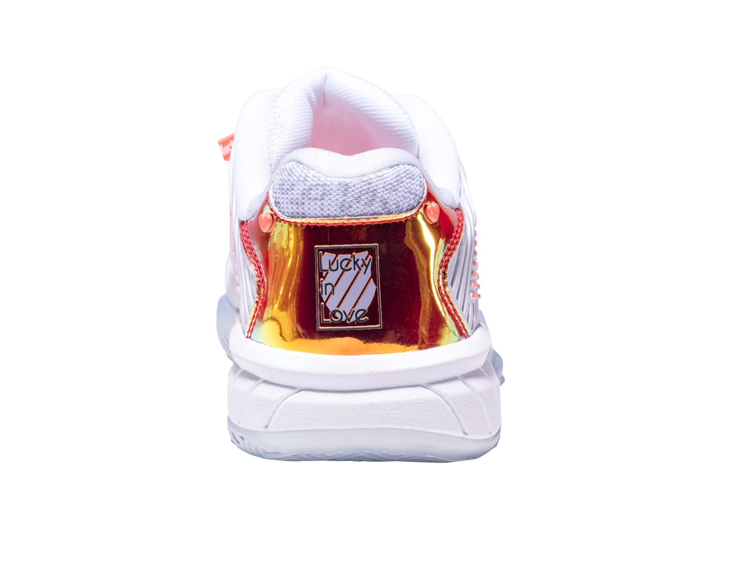 Leading tennis footwear and apparel brands K-Swiss and Lucky In Love make history by collaborating together on a limited edition product collection. K-Swiss used the tennis industry’s best-selling footwear model, Hypercourt Express 2, and worked with Lucky In Love founder Brad Singer and his design team to create a shoe. The Hypercourt Express 2 x Lucky in Love shoe has features not available on any other current K-Swiss footwear model, including collaboration logos, iridescent heel, and shank, as well as a translucent outsole .