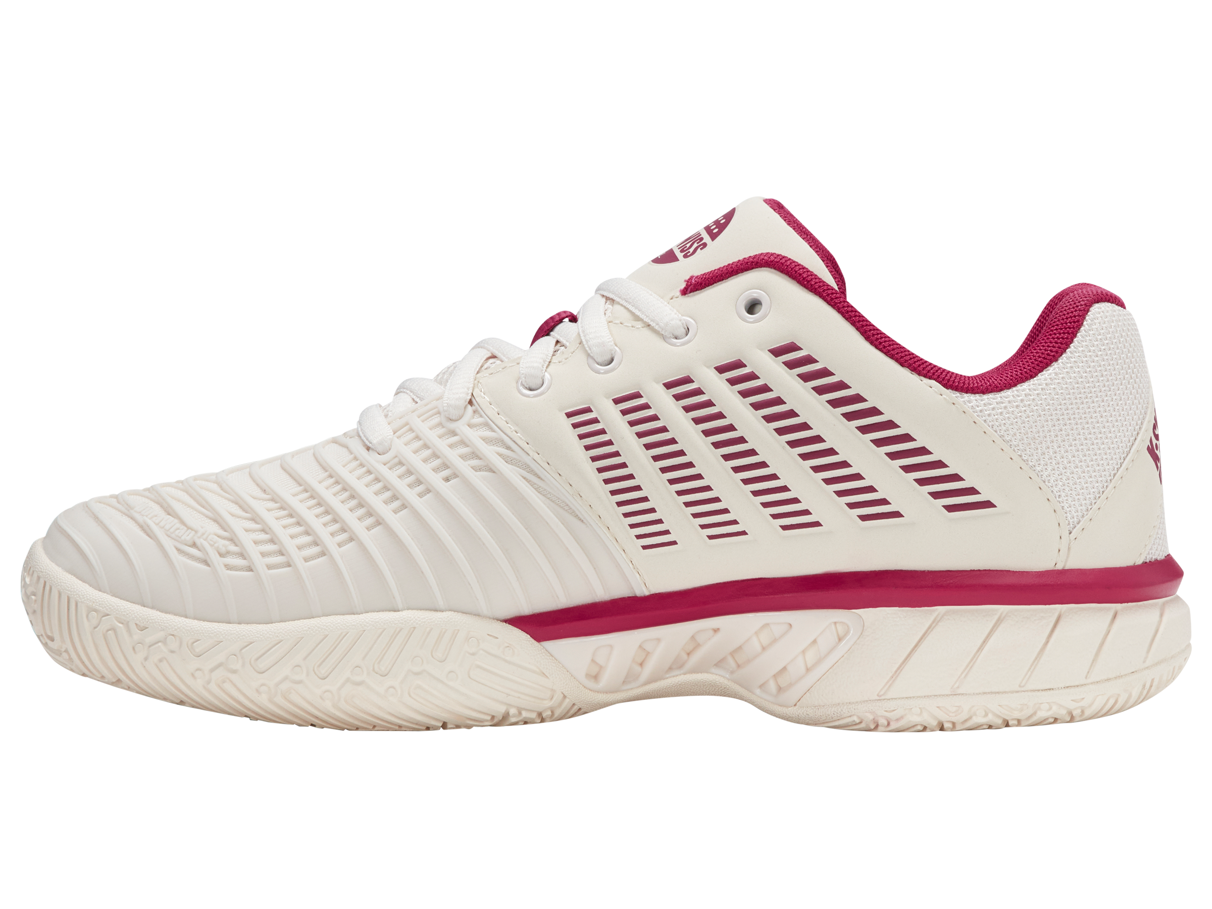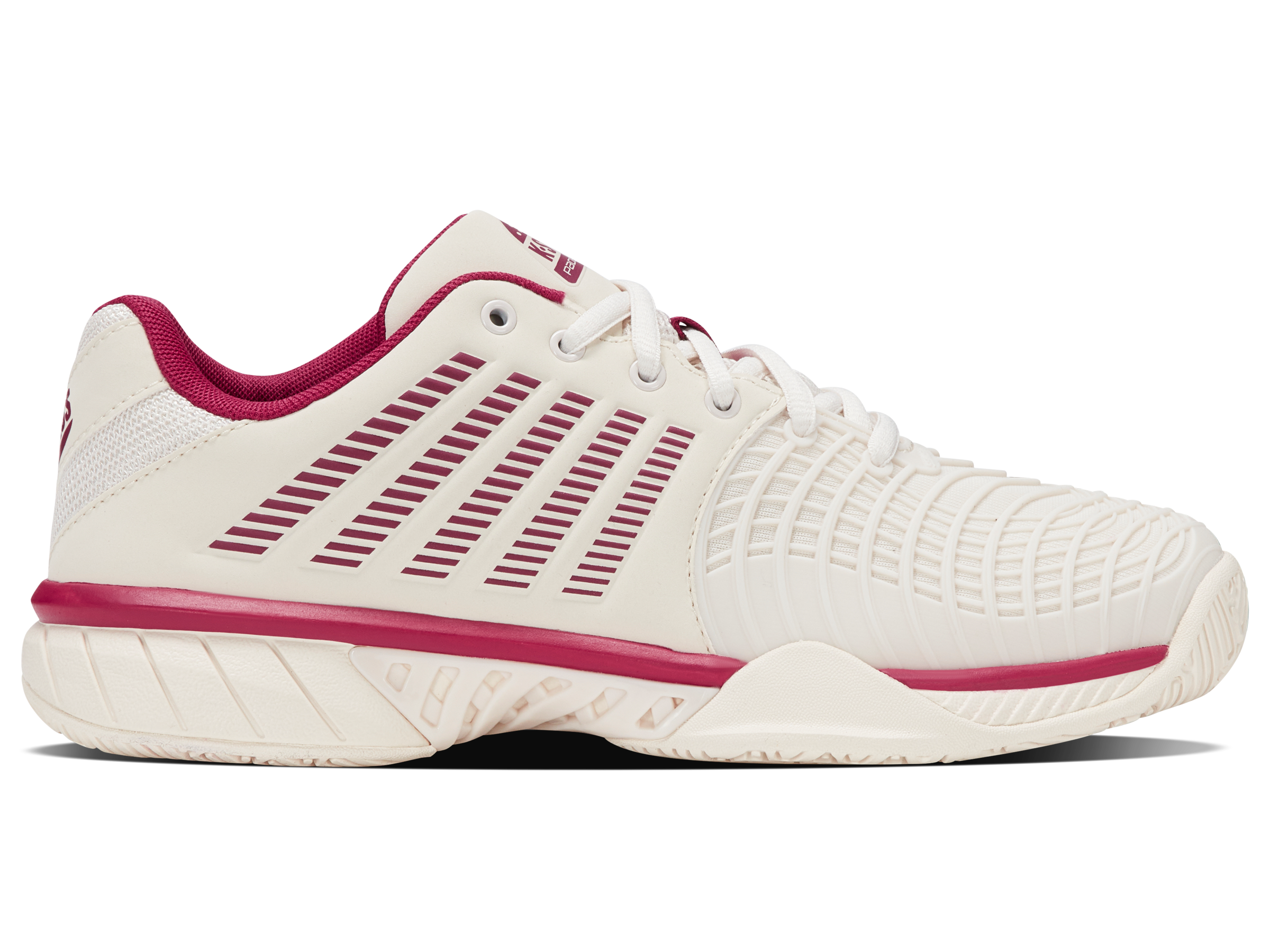 Der Express Light 3 HB Padel ist ein Padel-Schuh mit geringem Gewicht, der für Leistung auf dem Platz und ein hohes Maß an Komfort entwickelt wurde. Das Obermaterial besteht aus DuraWrap Flex, einem neu entwickelten, vorgeformten RPU-Käfig, der flexiblen Halt und Schutz beim Rutschen bietet. Innen bietet ein gut gepolsterter Kragen Komfort und Stabilität im Knöchelbereich, während eine gestanzte Schaumstoffeinlage unter dem Fuß für reaktionsfreudige Dämpfung sorgt. Der Express Light 3 hat eine HB-Außensohle mit tief eingekerbtem Fischgrätenmuster für außergewöhnliche Traktion auf dem Padel-Platz –sowohl auf Indoor- als auch auf Outdoor-Belägen.